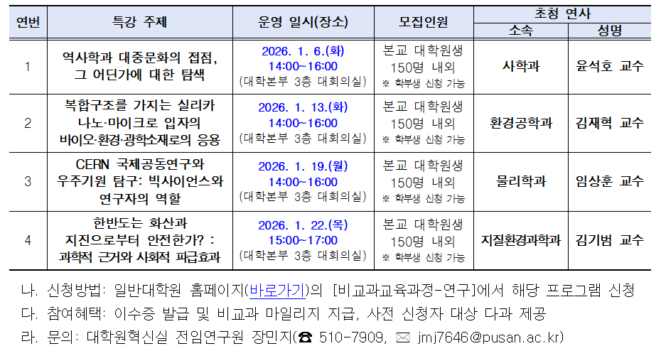 fnctId=bbs,fnctNo=13977 작성일 2025.12.26 수정일 2025.12.26 작성자 조영양 조회수 7 동계방학 교내 초청특강 시리즈 특강 운영 안내(2025년 겨울방학) 아래와 같이동계방학 비교과 특강을 안내 드리오니많은 참여 바랍니다. 첨부파일 (붙임) 2025학년도 동계방학 연구역량 강화 시리즈 특강 안내 포스터.pdf 미리보기